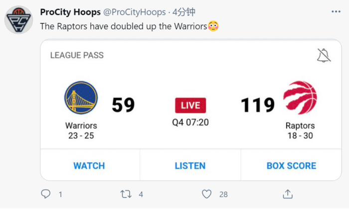 第三节则彻底推向高潮,猛龙单节轰出46比14的悬殊比分!勇士直接冲上热搜!众美媒和球迷纷纷发推调侃场面之惨烈!值得一提的是,单节赢对手32分刷新了猛龙单节净胜队史纪录,而自从1954-55赛季以来,这是勇士首次单节惨败30分以上!