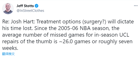 据Jeff Stotts报道,哈特采取哪种治疗方案?手术吗?这意味他将缺席很久。自2005-06赛季以来,UCL拇指(拇指韧带)修复的平均缺阵次数约为26场,大概是7周;目前常规赛还剩下不到6周的比赛,哈特真要提前赛季报销吗?