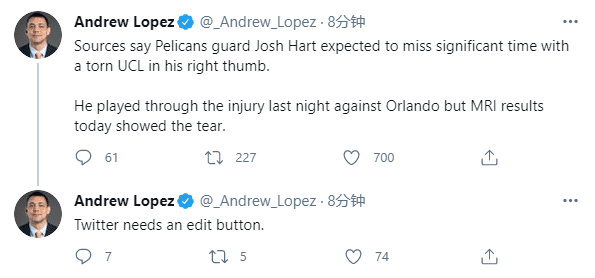 来源:24直播网04-03 18:0224直播网4月3日讯 鹈鹕遭遇伤病大麻烦,锡安、英格拉姆、鲍尔都在伤病名单上,哈特则是重大伤病,据鹈鹕记者AndrewLopez报道,鹈鹕后卫约什-哈特因遭遇右手拇指副韧带撕裂,预计将长期缺阵,很可能常规赛提前报销。