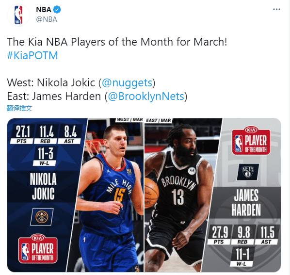 官宣三月最佳大奖!西部约基奇创纪录,哈登蝉联创两大神迹成历史首人