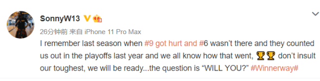 来源:24直播网04-01 20:3424直播网讯北京时间4月1日,广东外援威姆斯在个人社交媒体更新动态,动情地写道:我记得上赛季,当9号易建联受伤、6号马尚·布鲁克斯不在的情况下,他们都认为我们在季后赛没戏了。但只有我们自己知道,我们是如何走到最后的。不要低估我们夺冠的坚强意志,我们会准备好的,问题只在于“你想不想去做到”!