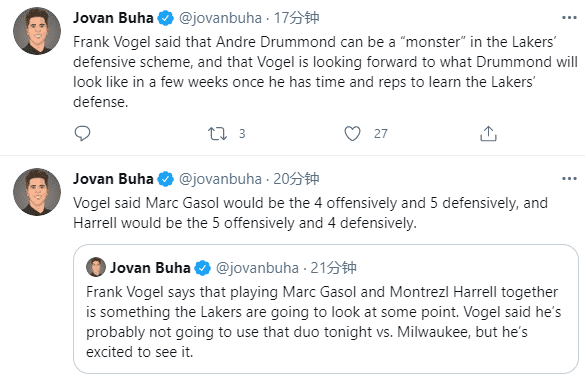沃帅谈到庄神首秀,表示:如果他说他需要休息,湖人会给他一个休息的机会,德拉蒙德的状态很好,他将在今晚的比赛中首发出战,没有出场时间限制;德拉蒙德在防守端的身体天赋和篮球智商非常出色,他会在防守端成为一头野兽,不过他还需要花点时间才能跟上球队的节奏。