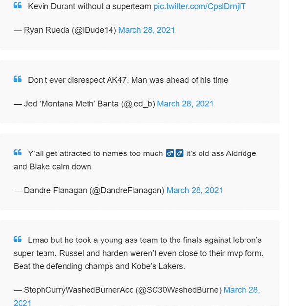 杜兰特这样的行为也被不少的球迷吐槽是在抱团,他又在组建超强球队,甚至还有美国网友嘲讽杜兰特,称他一辈子只加入超级球队,单核都不如基里连科(前篮网明星球员)。同时球迷们还给举杜兰特的例子,他在雷霆打进总决赛,队友是二阵威少,最佳第六人哈登和一防伊巴卡;之后去到的是73胜的勇士,当时公认的抱团行为。现在又来到篮网拉拢了欧文和哈登等联盟顶级巨星,所以球迷吐槽杜兰特不在超级球队就不会打球。