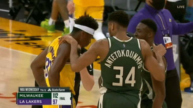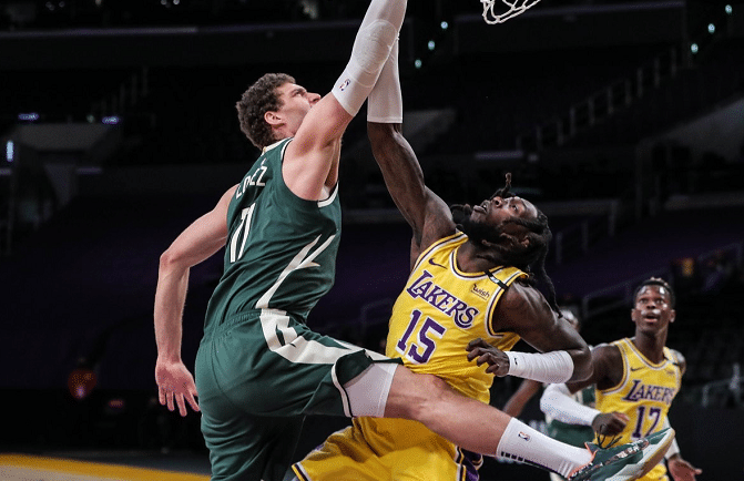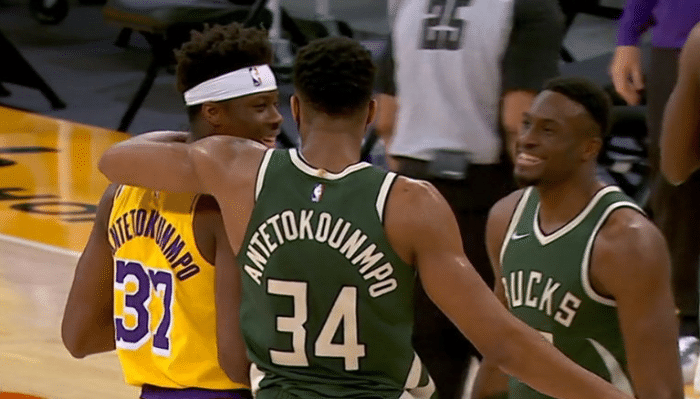 这场比赛进行到最后阶段,胜负的悬念已经不大,双方更多的是练兵,这个时候字母哥还没有下场,而布帅大手一挥将字母哥哥派上场。湖人这边眼看胜负悬念已经彻底消失,所以派上了字母兄弟中唯一有总冠军的字母弟,这样字母哥哥、字母哥和字母弟三兄弟同场竞技,这一幕也值得纪念。