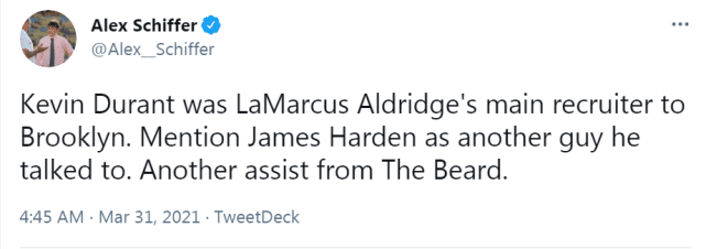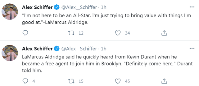 来源:24直播网03-31 15:0824直播网讯北京时间3月31日,篮网新援阿尔德里奇在加盟后首次接受采访,据他透露,杜兰特和哈登是招募自己的篮网球星,其中,杜兰特招募最积极,而哈登也找他交流过。篮网记者Alex Schiffer调侃道:“这是大胡子送出的又一记助攻。”