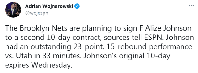 据名记沃纳罗斯基报道,篮网计划和阿利兹-约翰逊再签一份10天合同,此前的合同将在北京时间本周四到期。约翰逊在第一份10天合同期间,为篮网出战一场,打了33分钟,轰下23分15篮板3助攻2抢断,表现让人赞叹。如今,篮网愿意再给他一次机会,提供了第二份短合同。
