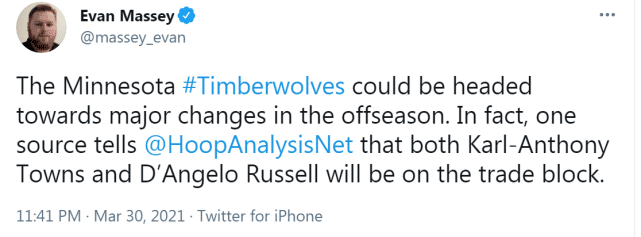 来源:24直播网03-31 15:0524直播网讯北京时间3月31日,据NBA记者Evan Massey报道,森林狼可能在今年休赛期迎来巨变。消息源告知他,卡尔-安东尼-唐斯和丹吉洛-拉塞尔届时将被摆上货架,具备交易的可能性。赛季至今,森林狼只取得11胜36负的战绩,排名联盟倒数第一。