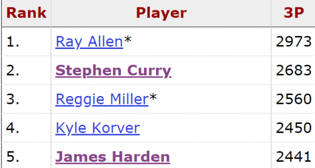 第五,哈登常规赛生涯已经投中2441个三分球,只要再进9个三分球,就能追平三分历史排名第4的科沃尔。本赛季至今,哈登最多曾单场命中6个三分,而上赛季,哈登曾有4场比赛至少投进9记三分球。