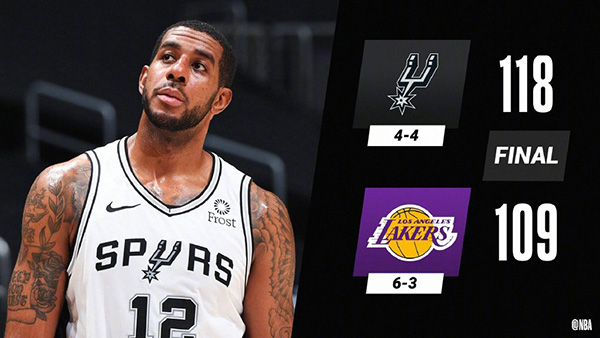 湖人109-118不敌马刺 阿德28分 詹姆斯27+6+12