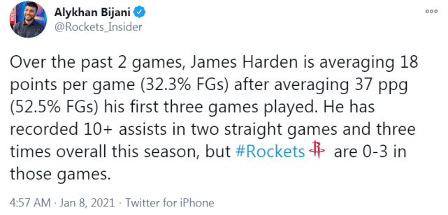 火箭记者Bijani指出,哈登本赛季已经有3场比赛助攻上双,而火箭在这三场比赛里竟然是0胜3负,无一胜绩。主场迎战6胜2负的魔术,火箭能击败对手吗?赛季至今,魔术客场3胜0负,还没在客场输过球。