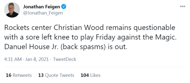 24直播网北京时间1月8日讯火箭官方更新了球队的最新伤情。缺席对步行者一战的豪斯和伍德,依然在球队的伤病名单上。豪斯由于背部痉挛,将继续缺席主场对魔术的比赛,而伍德(左膝酸痛)是出战成疑(questionable,50%上场可能)的状态。