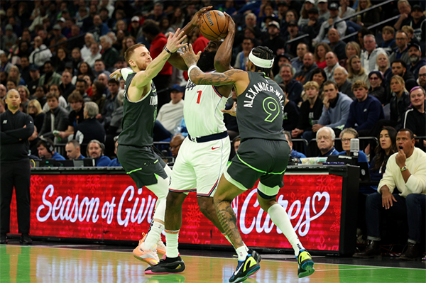NBA杯赛小组赛关键一战,小卡因伤继续休战,哈登第一节登场10分钟,5投2中、三分2中2拿到6分3篮板3助攻和1次抢断,在哈登的带领下,快船和森林狼打得十分胶着,首节25-26落后1分。