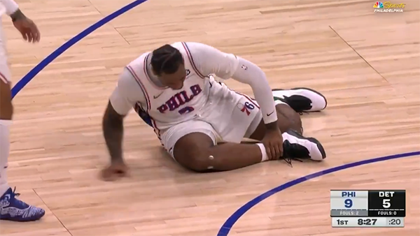 第一节8分27秒,德拉蒙德在争抢篮板的过程中意外受伤,落地踩到哈里斯的脚,导致脚踝呈90度扭伤,随后德拉蒙德捂着脚踝痛苦倒地,脚踝无法用力,被两人搀扶返回更衣室,之后76人官方宣布,德拉蒙德因脚踝扭伤,本场比赛不会回归。