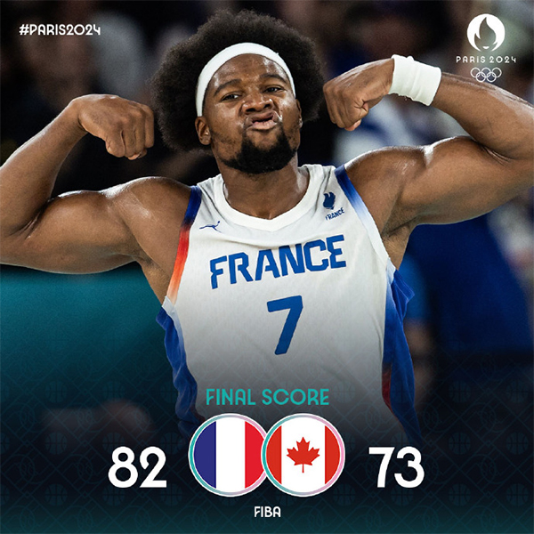 24直播网讯 8月7日讯 奥运男篮1/4决赛,法国对阵加拿大,本场比赛法国主动变阵将戈贝尔和富尼耶撤下主力。开场后法国状态不错,尤其是提上首发的科尔迪尼耶首节独得10分,反观加拿大先发手感低迷打了8分钟只得5分。第二节加拿大状态稍有回暖,法国坚决进攻内线制造杀伤,亚历山大手感回暖连连砍分一度帮助加拿大将分差追到个位数,但法国依靠亚布塞莱和莱索尔坚决冲击内线又将比分拉开。下半场回来亚历山大状态依旧火热,他再次帮助加拿大追到只差8分,法国依靠积极的拼抢稳住阵脚,末节两队亚历山大和巴雷特两人联手多次发起反扑,关键时刻富尼耶连续砍分并且命中一记超远三分帮助法国始终保持优势,加拿大无力回天,最终法国82-73击败加拿大晋级四强。