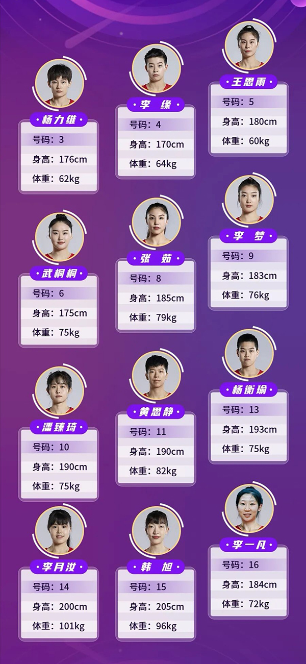 出征赛事的中国队12名队员为杨力维、李缘、王思雨、武桐桐、张茹、李梦、潘臻琦、黄思静、杨衡瑜、李月汝、韩旭、李一凡。