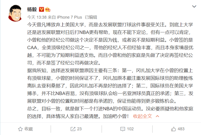 来源:24直播网04-25 17:4524直播网讯 今天早些时候,一条重磅的新闻,先是由名记Shams爆料出曾凡博决定不去冈萨加将前往发展联盟“点燃计划”,随后国内媒体人争相报道评论!