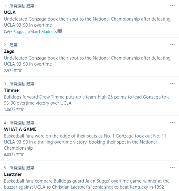 来源:24直播网04-04 13:5624直播网讯NCAA疯狂三月半决赛,冈萨加大学加时绝杀UCLA,状元大热门萨格斯投进logo式超远压哨绝杀三分,以31战全胜的战绩挺进锦标赛决赛;萨格斯3分压哨绝杀瞬间登上推特热搜引发巨大热议,抢走NBA风头成今日头条。