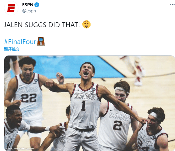 状元大热门萨格斯三分绝杀引爆全美,直接霸占推特热搜榜前五引爆全美,抢走NBA的眼球成为今日头条;赛后回到更衣室,冈萨加大学更衣室疯狂泼水庆祝,主教练更是疯狂地双手倒立庆祝,然后疯狂挥拳。