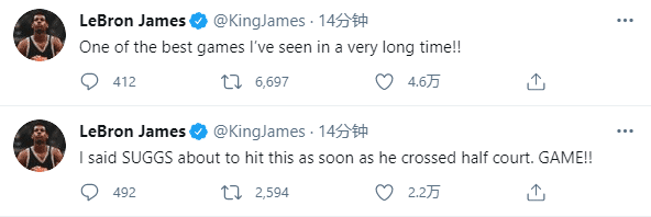 詹姆斯发推,写道:我的天哪!哇!我就知道!萨格斯刚过半场我就知道他要投进这个球了!这是我最近一段时间我看到的最好看的一场比赛了!