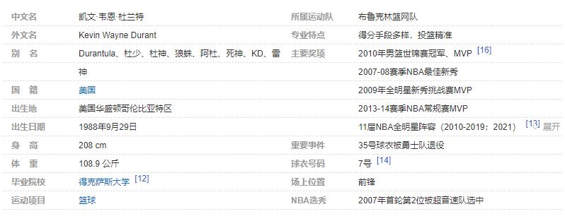 凯文·杜兰特(Kevin Durant),1988年9月29日出生于美国华盛顿哥伦比亚特区(Washington, District of Columbia),美国职业篮球运动员,司职前锋,效力于NBA布鲁克林篮网队。个人简介: