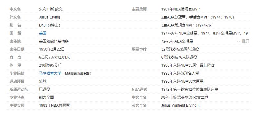 朱利叶斯·欧文(Julius Erving),1950年2月22日出生于美国纽约州东梅多(East Meadow, NY),前美国职业篮球运动员,司职小前锋,绰号“J博士”(Dr.J),开创了现代篮球在空中、篮筐之上表演的先河。个人简介: