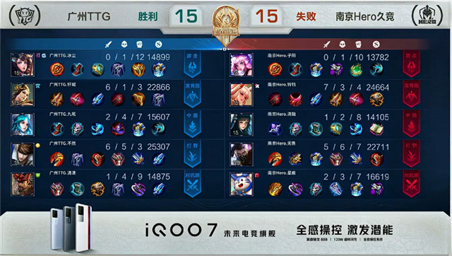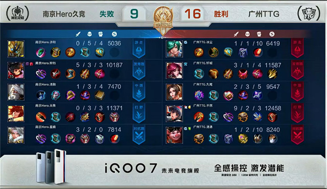 双方常规开局。1分07秒广州TTG拿下中路河道之灵。2分51秒双方暴君处1换1。3分09秒南京Hero发育路击杀蒙犽。3分33秒南京Hero拿下暴君。5分14秒南京Hero对抗路打出1换2。5分54秒南京Hero拿下主宰。7分44秒广州TTG对抗路击杀后羿。7分52秒南京Hero拿下暴君。8分28秒南京Hero中路击杀关羽。9分23秒野区团战南京Hero打出0换4。9分54秒南京Hero摧毁敌方对抗路高地塔。10分26秒广州TTG抢到暗影暴君,南京Hero击杀太乙真人。11分06秒南京Hero拿下暗影主宰。12分02秒野区团战南京Hero打出1换3。12分41秒南京Hero摧毁敌方中路高地塔。14分02秒高地团战南京Hero击杀关羽。14分18秒高地团战南京Hero击杀太乙真人。14分39秒南京Hero久竞团灭对手摧毁水晶拿下比赛。