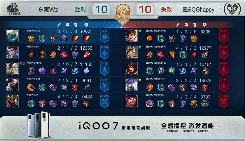 双方常规开局。51秒东莞Wz上路击杀猪八戒拿到一血。1分05秒东莞Wz拿下中路河道之灵。2分25秒重庆QG野区击杀兰陵王并拿下暴君。4分36秒重庆QG下路打出0换2。4分44秒重庆QG摧毁敌方下路外塔。5分05秒重庆QG摧毁敌方下路二塔。5分11秒重庆QG拿下主宰。6分18秒东莞Wz暴君处击杀镜。8分04秒双方上路游走互换,重庆QG摧毁敌方下路二塔。9分20秒重庆QG拿下主宰。10分11秒东莞Wz中路击杀猪八戒。12分17秒暴君处团战重庆QG打出1换3。13分16秒重庆QG中路击杀盾山并摧毁中路外塔。13分39秒重庆QG拿下暗影主宰。18分06秒重庆QG下路镜单杀兰陵王。16分31秒上路团战重庆QG摧毁敌方上路高地塔,东莞Wz打出1换5。17分28秒东莞Wz摧毁敌方水晶拿下比赛。