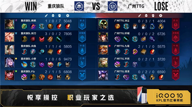 开局重庆狼队反掉敌方蓝野区并击杀虞姬拿到一血。2分34秒双方野区1换1。4分41秒重庆狼队对抗路击杀廉颇。6分04秒重庆狼队拿下暴君。7分59秒暴君处团战广州TTG击杀沈梦溪。8分57秒重庆狼队拿下主宰。9分57秒中路团战重庆狼队打出1换2。10分48秒重庆狼队拿下暗影主宰。11分49秒重庆狼队拿下暗影主宰。13分25秒重庆狼队摧毁敌方中路外塔。14分07秒重庆狼队发育路打出1换2。14分29秒重庆狼队摧毁敌方中路二塔。14分46秒重庆狼队拿下暗影主宰。15分34秒重庆狼队野区击杀廉颇。16分20秒重庆狼队野区击杀澜。16分27秒对抗路团战重庆狼队打出0换2。16分53秒重庆狼队摧毁敌方水晶拿下比赛。