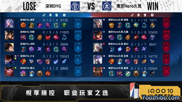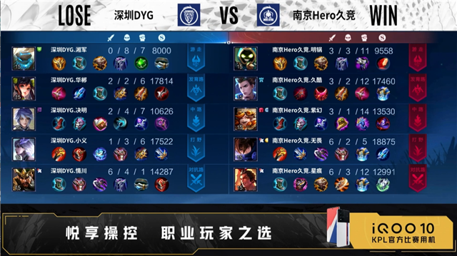 开局中路南京Hero久竞三人抢线。1分26秒中路南京Hero久竞击杀蒙犽,拿下一血。3分02秒深圳DYG拿下主宰,南京Hero久竞拿下暴君。3分58秒对抗路深圳DYG击杀蒙恬,发育路击杀李元芳,打出0换2。5分49秒深圳DYG摧毁敌方对抗路外塔,河道团战双方打出1换1。7分24秒深圳DYG拿下主宰,摧毁敌方发育路外塔。8分32秒发育路南京Hero久竞击杀蒙犽,拿下暴君。9分13秒发育路南京Hero久竞击杀猪八戒,双方打出2换2。10分44秒深圳DYG拿下暗影暴君,南京Hero久竞摧毁敌方对抗路外塔。11分24秒中路南京Hero久竞击杀猪八戒,野区击杀澜,打出0换2,摧毁敌方中路外塔,拿下暗影主宰。12分25秒野区南京Hero久竞击杀蒙犽,摧毁敌方发育路外塔。13分32秒南京Hero久竞摧毁敌方中路二塔,深圳DYG澜二连击破,摧毁敌方中路外塔。14分34秒深圳DYG拿下暗影暴君,摧毁敌方对抗路外塔。15分34秒深圳DYG摧毁敌方发育路外塔。17分18秒野区南京Hero久竞击杀上官婉儿,拿下暗影主宰,摧毁敌方中路高地,打出0换5,团灭对手摧毁水晶拿下比赛。