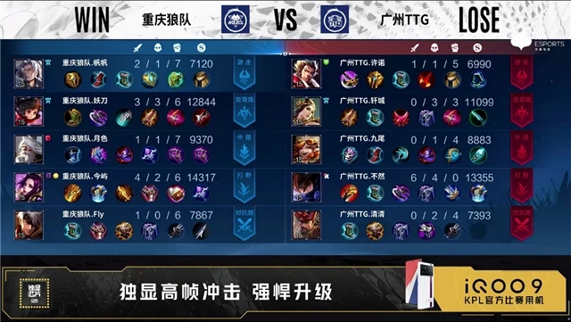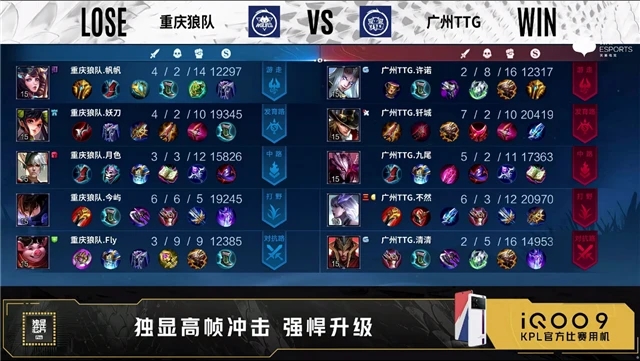 第一局开局重庆狼队入侵敌方野区,50秒双方野区团打出1换1。2分15秒广州TTG对抗路击杀澜。2分37秒重庆狼队拿下先知主宰。2分51秒广州TTG拿下暴君。3分35秒重庆狼队发育路击杀干将莫邪。5分08秒重庆狼队摧毁敌方发育路外塔。5分10秒对抗路团重庆狼队打出1换2。6分06秒中路下河道团双方1换1。7分09秒广州TTG拿下主宰,随后摧毁敌方对抗路外塔。7分57秒重庆狼队拿下暴君,中路团双方1换1。9分15秒中路团重庆狼队打出1换2。11分42秒重庆狼队拿下暗影暴君,团战重庆狼队打出1换3。13分15秒重庆狼队野区击杀马可波罗,随后拿下暗影主宰。13分52秒重庆狼队先后摧毁敌方中路、对抗路二塔。15分39秒广州TTG中路击杀猪八戒。15分52秒重庆狼队拿下暗影暴君。16分45秒重庆狼队摧毁敌方发育路二塔。17分19秒重庆狼队中路击杀东皇太一。17分56秒重庆狼队摧毁敌方对抗路高地塔。18分44秒重庆狼队摧毁敌方中路高地塔。19分44秒重庆狼队高地处击杀干将莫邪。20分钟高地团广州TTG打出2换3。22分钟中路团广州TTG打出1换2。23分20秒野区团广州TTG打出2换4。24分12秒广州TTG拿下风暴龙王。26分15秒野区团广州TTG打出0换2。27分04秒广州TTG先后摧毁敌方中路、发育路高地塔。28分25秒中路上河道团广州TTG打出0换2。28分52秒广州TTG拿下风暴龙王。30分21秒广州TTG摧毁敌方水晶拿下比赛。