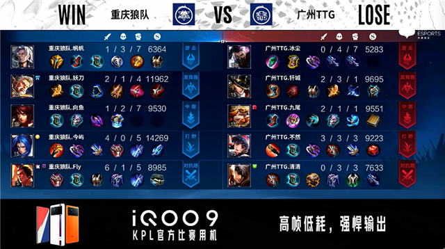 开局广州TTG公孙离中路抢线。2分15秒广州TTG拿下暴君。3分16秒野区团战广州TTG打出1换3。3分58秒重庆狼队发育路击杀不知火舞。6分14秒广州TTG野区击杀澜。7分20秒广州TTG对抗路击杀沈梦溪并摧毁对抗路二塔。8分35秒野区团战广州TTG打出0换2。8分49秒广州TTG摧毁敌方对抗路高地塔。11分58秒中路团战广州TTG打出0换2并摧毁中路二塔。12分34秒广州TTG摧毁敌方水晶拿下比赛。