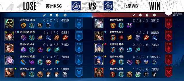 1分钟北京WB入侵蓝区,橘右京拿下一血。3分半暴君团,露娜被击杀,橘右京拿下暴君。5分15秒马可波罗被击杀。6分11秒中路团战,双方1换1。6分20秒橘右京推掉上路一塔。7分钟橘右京拿下主宰。8分钟露娜拿下暴君。9分钟中路团战,双方1换1,苏州KSG中路一塔被破。10分21秒橘右京拿下主宰。11分50秒暴君团,北京WB打出0换3,弈星拿下暴君。12分33秒北京WB推掉水晶率先拿下赛点。