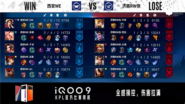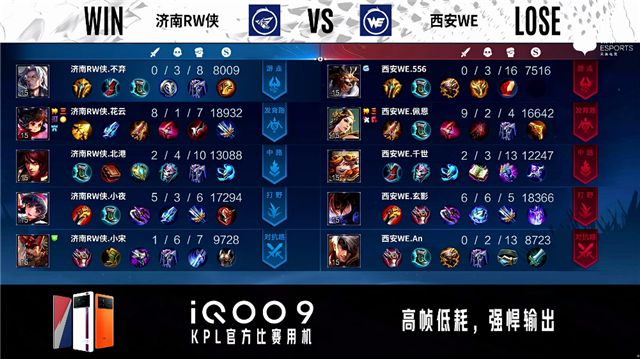 54秒,西安WE嬴政击杀弈星拿下一血。1分10秒,西安WE兰陵王击杀关羽。1分53秒,西安WE镜击杀弈星。2分08秒,西安WE控下先知主宰,随后济南RW侠控下暴君。3分钟,西安WE猪八戒击杀关羽。3分36秒,西安WE上路击杀关羽。5分52秒,西安WE破掉济南RW侠上二塔。6分21秒,西安WE控下先知主宰。7分29秒,西安WE破掉济南RW侠下二塔,随后团战济南RW侠打出1换2。7分58秒,济南RW侠控下暴君。8分47秒,西安WE破掉济南RW侠中一塔。10分17秒,西安WE控下暗影暴君。10分47秒,西安WE控下暗影主宰。11分27秒,西安WE下路打出0换2。11分53秒,西安WE破掉济南RW侠中二塔并击杀成吉思汗。12分12秒,西安WE破掉济南RW侠下、中高地。12分32秒,西安WE破掉济南RW侠上高地并打出0换2。12分42秒,西安WE摧毁济南RW侠水晶,让二追三赢下比赛!