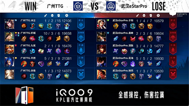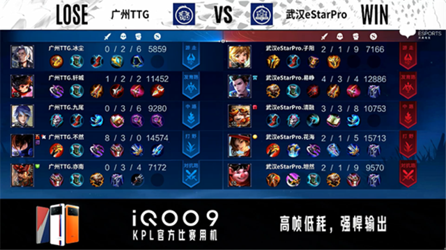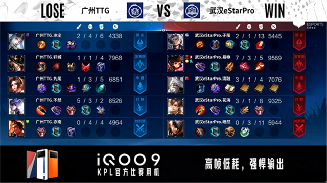 双方常规开局。2分17秒武汉eStar拿下暴君。2分28秒广州TTG拿下主宰。2分36秒广州TTG发育路击杀张飞拿到一血。4分17秒武汉eStar发育路击杀虞姬。5分03秒广州TTG发育路击杀周瑜,中路击杀张飞。6分31秒武汉eStar拿下暴君。7分06秒武汉eStar拿下主宰。8分36秒武汉eStar摧毁敌方中路外塔。9分43秒双方发育路1换1。10分44秒武汉eStar拿下暗影暴君。11分12秒武汉eStar主宰处打出1换2。12分45秒双方发育路1换1。13分38秒发育路团战武汉eStar击杀虞姬。14分47秒武汉eStar拿下暗影暴君。15分02秒武汉eStar野区击杀橘右京。15分36秒武汉eStar发育路击杀虞姬。15分51秒高地团战双方1换1,武汉eStar破掉敌方中路、对抗路发育塔。18分46秒高地团战广州TTG打出0换3。21分28秒中路团战广州TTG打出0换2。22分28秒广州TTG拿下风暴龙王。23分37秒广州TTG摧毁敌方对抗路高地塔。25分09秒广州TTG对抗路击杀沈梦溪。25分35秒广州TTG摧毁敌方中路高地塔。26分06秒广州TTG拿下风暴龙王,野区团战广州TTG打出1换2。27分02秒广州TTG团灭对手摧毁水晶拿下比赛。