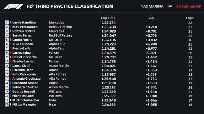 24直播网讯 2021赛季收官战,F1阿布扎比大奖赛第三次练习赛在亚斯湾码头赛道结束,梅赛德斯车队的汉密尔顿最快1:23.274排名第一,红牛车队的维斯塔潘落后0.214秒第二,两人的成绩均使用红色软胎做出。博塔斯和佩雷兹分列三四位,与头名差距均超过0.7秒。