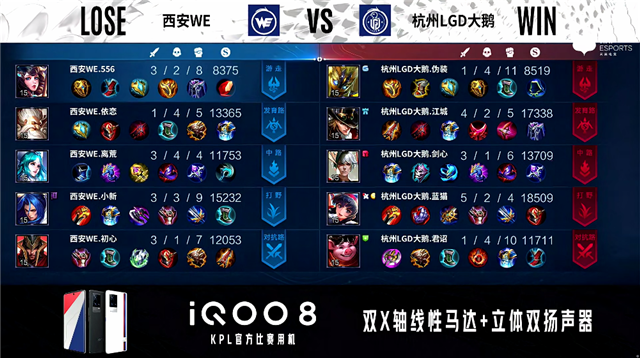 2分06秒,西安WE大乔击杀猪八戒拿下一血。2分33秒,西安WE控下先知主宰,杭州LGD大鹅控下暴君。3分31秒,杭州LGD大鹅马可波罗下路击杀老夫子。4分08秒,双方两处交火,双方1换1。4分32秒,西安WE中路击杀鬼谷子,随后西安WE老夫子推掉杭州LGD大鹅下一塔。5分50秒,西安WE团战打出0换2,杭州LGD大鹅破掉西安WE下一塔。6分53秒,西安WE击杀马可波罗,随后再击杀猪八戒并破掉杭州LGD大鹅上二塔。7分57秒,西安WE击杀鬼谷子。8分20秒,杭州LGD大鹅控下先知主宰。9分05秒,双方团,杭州LGD大鹅打出1换3。9分20秒,杭州LGD大鹅破掉西安WE中一塔。10分15秒,杭州LGD大鹅控下暗影主宰。12分07秒,杭州LGD大鹅控下暗影暴君。13分16秒,杭州LGD大鹅破掉西安WE中二塔,随后破掉西安WE上二塔。14分10秒,双方团,双方1换1。14分50秒,杭州LGD大鹅控下暗影主宰。15分40秒,杭州LGD大鹅上路打出0换2,随后破掉西安WE上高地。16分45秒,双方团战1换1。17分钟,杭州LGD大鹅控下暗影暴君。19分04秒,西安WE破掉杭州LGD大鹅下二塔,杭州LGD大鹅控下暗影主宰。20分20秒,西安WE击杀娜可露露。21分21秒,杭州LGD大鹅娜可露露抢到风暴龙王,随后团战杭州LGD大鹅打出1换5团灭对手。21分59秒,杭州LGD大鹅摧毁西安WE水晶赢下比赛。