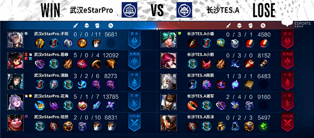 双方和平开局。1分20秒武汉eStarPro入侵野区,西施拿下一血,团战武汉eStarPro打出1换2。2分21秒暴君团,露娜被击杀,赵云拿下暴君。4分50秒露娜拿下主宰。5分10秒武汉eStarPro入侵野区,姜子牙被击杀。5分21秒李元芳推掉中路一塔。5分40秒赵云被击杀。6分10秒武汉eStarPro入侵野区,团战打出0换3。6分37秒露娜拿下暴君。8分37秒李元芳推掉中路二塔。9分钟李元芳推掉上路二塔,庄周被击杀。10分20秒露娜拿下暴君。12分钟李元芳推掉中路高地塔。12分20秒露娜拿下主宰。13分40秒高地团,李元芳拿下三杀,团战武汉eStarPro打出1换4。13分51秒武汉eStarPro推掉水晶拿下本场比赛胜利。