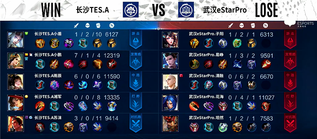 双方和平开局。2分17秒镜拿下暴君。4分37秒公孙离推掉下路一塔。5分50秒河道团战,澜拿下一血,团战长沙TES.A打出1换2。7分钟镜推掉下路高地塔。7分29秒武汉eStarPro上路一塔被破。8分20秒河道团战,蒙恬被击杀。9分钟镜拿下主宰。10分14秒镜拿下暴君。11分钟长沙TES.A中路一塔被破。11分40秒镜拿下主宰。12分40下路团战,双方1换1。14分27秒镜拿下暴君。16分钟镜拿下主宰。17分钟伽罗推掉下路二塔。17分10秒武汉eStarPro推掉下路高地塔,弈星被击杀。18分钟武汉eStarPro 强攻中路高地塔,镜拿下三杀。18分13秒武汉eStarPro推掉水晶率先拿下一分。