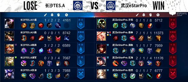 双方和平开局。2分钟上路团战,兰陵王拿下一血,双方1换1。3分41秒阿古朵拿下暴君,娜可露露拿下主宰。4分45秒上路团战,周瑜被击杀。5分10秒野区团战,马超被击杀。5分30秒公孙离推掉下路一塔。6分50秒上路团战,长沙TES.A打出1换2。7分50秒双方互换边路一塔。8分钟暴君团,沈梦溪被击杀,周瑜拿下暴君。8分12秒公孙离推掉中路一塔。9分10秒娜可露露拿下主宰。10分20秒娜可露露拿下暴君。11分钟娜可露露拿下主宰。12分50秒野区团战,武汉eStarPro打出0换3。13分14秒武汉eStarPro推掉水晶率先拿下赛点。
