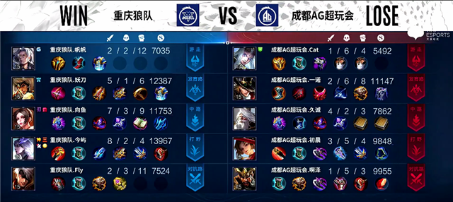 双方和平开局。2分27秒河道交火,镜拿下一血。2分40秒镜拿下暴君。3分钟重庆狼队入侵野区,马可波罗被击杀。3分40秒上路团战,双方2换2。4分40秒河道团战,成都AG超玩会打出0换3,成吉思汗推掉下路一塔,云缨拿下主宰。5分20秒马可波罗推掉上路一塔。5分30秒马可波罗推掉中路一塔。6分50秒野区团战,双方3换3。8分钟云缨拿下暴君。8分30秒下路交火,双方1换1。8分50秒上路团战,成都AG超玩会打出1换2。10分27秒镜拿下暴君,云缨拿下主宰,团战重庆狼队打出0换3。11分钟成吉思汗推掉中路一塔。15分钟镜拿下暴君。16分钟重庆狼队推掉中路高地塔,团战团灭成都AG超玩会。16分38秒重庆狼队推掉水晶拿下本场比赛胜利。