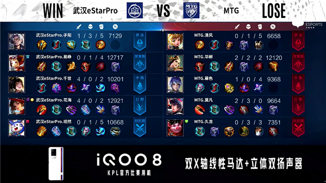 2分14秒,MTG控下暴君。3分49秒,武汉eStar澜下路击杀刘邦拿下一血。4分48秒,武汉eStar下路越塔击杀马可波罗。5分17秒,武汉eStar破掉MTG下二塔。6分26秒,MTG拿下暴君。6分45秒,武汉eStar拿下先知主宰并破掉MTG上二塔。7分15秒,武汉eStar中路打出0换2。7分53秒,武汉eStar中路越塔1换1。8分08秒,武汉eStar野区击杀不知火舞。8分26秒,武汉eStar破掉MTG中一塔,随后团战MTG打出1换4。9分12秒,MTG破掉武汉eStar中一塔。10分26秒,武汉eStar澜拿下暗影主宰。12分05秒,武汉eStar控下暗影暴君。13分21秒,武汉eStar破掉MTG中二塔。14分30秒,武汉eStar破掉MTG下高地。15分42秒,武汉eStar控下暗影主宰。16分16秒,武汉eStar击杀盘古。16分42秒,武汉eStar破掉MTG中高地。16分59秒,武汉eStar破掉MTG上高地。17分26秒,双方团,武汉eStar打出1换4。17分40秒,武汉eStar摧毁MTG水晶先下一城。