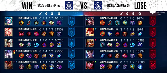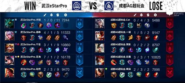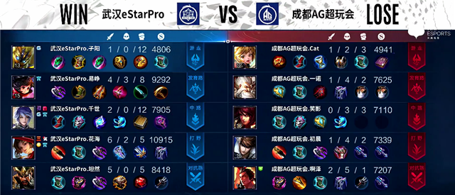 双方和平开局。1分45秒下路团战,裴擒虎拿下一血。2分25秒裴擒虎被击杀。3分05秒镜拿下暴君。4分25秒猪八戒被击杀。4分57秒镜拿下主宰。5分20秒成都AG超玩会下路一塔被破。5分50秒裴擒虎推掉上路一塔。6分25秒野区团战,蔡文姬被击杀。6分40秒上路团战,双方1换1。8分钟镜拿下暴君。9分12秒镜拿下主宰。9分30秒裴擒虎推掉下路二塔。10分钟上路团战,武汉eStarPro打出0换2。10分34秒镜拿下暴君。11分45秒中路团战,公孙离被击杀。12分钟裴擒虎拿下主宰。14分40秒公孙离拿下暴君。16分40秒镜拿下主宰。17分10秒公孙离推掉中路一塔。18分58秒镜拿下暴君。19分钟成都AG超玩会推掉上路高地塔。20分钟野区团战,武汉eStarPro打出1换3。20分25秒武汉eStarPro推掉中路高地塔,团战团灭成都AG超玩会。21分钟镜拿下风暴龙王。26分45秒镜拿下风暴龙王。28分14秒武汉eStarPro推掉水晶率先拿下一分。
