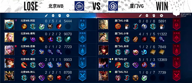双方和平开局。1分40秒中路团战,镜拿下一血。2分08秒镜拿下暴君,裴擒虎拿下主宰。3分15秒下路团战,镜被击杀,北京WB推掉下路一塔。5分13秒上路团战,北京WB打出0换2。5分30秒中路团战,双方2换2,北京WB推掉中路一塔。6分钟裴擒虎拿下暴君。7分58秒裴擒虎拿下主宰。10分30秒李元芳拿下主宰。11分钟李元芳拿下暴君。11分45秒裴擒虎推掉中路高地塔,团战厦门VG打出1换2。14分10秒高地团战,厦门VG打出1换2。15分钟裴擒虎拿下暴君。15分45秒中路团战,厦门VG打出1换2。18分16秒北京WB中路一塔被破。19分钟中路团战,双方1换1。19分16秒野区团战,厦门VG打出0换2。20分40秒风暴龙王团,关羽被击杀。21分44秒裴擒虎拿下风暴龙王。22分40秒上路团战,厦门VG团灭北京WB。23分47秒马可波罗推掉中路高地塔。25分30秒河道团战,李元芳被击杀。26分40秒镜拿下风暴龙王。28分16秒马可波罗推掉下路高地塔。29分05秒厦门VG推掉水晶追回一分。