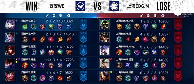 开局上海EDG.M入侵野区,橘右京拿下红Buff。2分20秒橘右京拿下暴君。4分50秒战云拿下主宰。5分10秒鲁班七号推掉下路一塔,5分20秒中路团战,6分钟橘右京拿下暴君。7分钟野区团战,双方3换3。8分33秒鲁班七号推掉下路二塔。10分10秒赵云拿下暴君,西安WE中路一塔被破,橘右京拿下主宰。11分钟上路团战,上海EDG.M打出0换3。11分40秒鲁班七号推掉中路高地塔。12分55秒高地团,双方1换1。14分钟橘右京拿下暴君。15分45秒中路团战,双方2换2。17分30秒河道团战,双方1换1。19分20秒廉颇被击杀。20分钟风暴龙王团,西安WE打出0换4。21分钟赵云拿下风暴龙王。22分40秒西安WE推掉上路高地塔。27分钟中路团战,赵云被击杀。27分55秒上海EDG.M推掉水晶率先拿下一分。