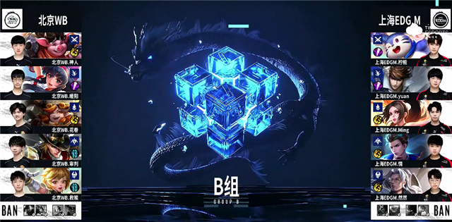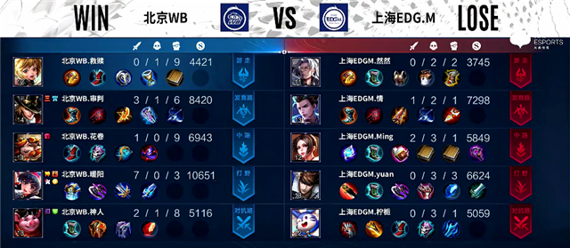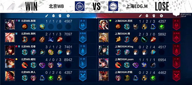 双方和平开局。2分钟北京WB下路越塔强攻,公孙离拿下一血。2分47秒云缨拿下暴君。4分39秒上海EDG.M上路一塔被破。5分钟北京WB入侵野区,廉颇被击杀。5分20秒公孙离推掉下路一塔。6分36秒上海EDG.M中路一塔被破。7分11秒中路团战,北京WB打出0换2并推掉中路二塔。7分51秒周瑜推掉下路高地塔。8分10秒上海EDG.M上路二塔被破。9分40秒北京WB推掉上路高地塔,团战打出2换3。10分22秒北京WB推掉水晶拿下本场比赛胜利。