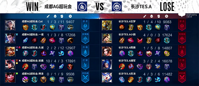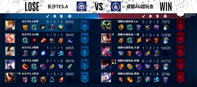 开局长沙TES.A入侵野区,澜拿下一血。1分36秒上路交火,梦奇被击杀。2分20秒澜拿下主宰。4分40秒夏侯惇被击杀,梦奇推掉上路一塔。4分50秒镜拿下暴君。6分30秒梦奇拿下主宰。8分34秒鲁班七号推掉下路二塔。9分17秒澜拿下暴君。10分20秒野区团战,成都AG超玩会打出0换2。11分钟鲁班七号推掉中路一塔。11分32秒澜拿下主宰。13分39秒鲁班七号推掉上路高地塔。15分钟成都AG超玩会推掉中路高地塔,团战团灭长沙TES.A。15分23秒成都AG超玩会推掉水晶拿下本场比赛胜利。