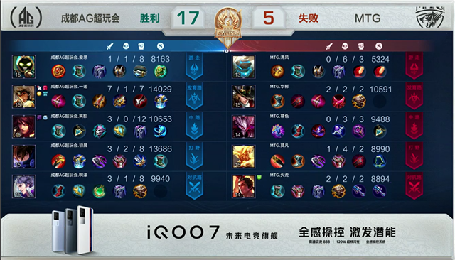 53秒,MTG不知火舞击杀嫦娥拿下一血。2分36秒,MTG拿下暴君。4分01秒,下路团,双方2换2,成都AG嫦娥拿下双杀。5分35秒,成都AG下路越塔打出0换3。7分22秒,MTG击杀兰陵王。7分35秒,下路团,MTG打出1换2。8分45秒,下路团,MTG打出0换4。9分01秒,MTG破掉成都AG下二塔。9分50秒,双方团战1换1。10分58秒,野区团,MTG打出2换3。12分24秒,MTG拿下暗影暴君,随后破掉成都AG中二塔。12分45秒,中路团,MTG打出1换4并破掉成都AG中高地。13分17秒,MTG团灭对手后破掉成都AG水晶赢下比赛。
