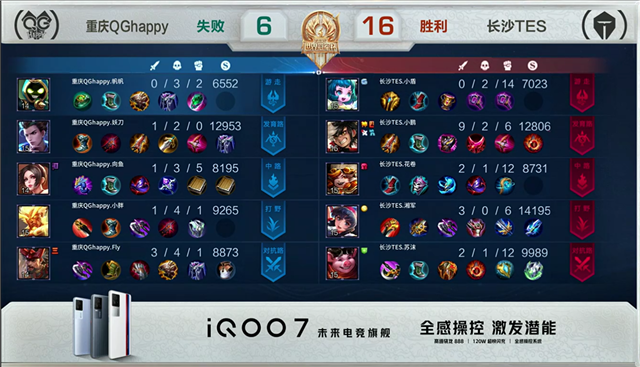 1分53秒,长沙TES花木兰上路击杀梦奇拿下一血。3分16秒,长沙TES拿下暴君。3分56秒,重庆QG强推掉长沙TES中一塔,长沙TES反打打出1换2。6分23秒,中路团,重庆QG打出1换2。7分43秒,长沙TES中路击杀虞姬。9分58秒,双方团,长沙TES打出1换3。10分33秒,长沙TES拿下暗影暴君。11分17秒,长沙TES上官婉儿击杀东皇太一。12分24秒,长沙TES拿下暗影主宰。13分42秒,长沙TES接连破掉重庆QG下、上二塔。14分11秒,长沙TES破掉重庆QG上高地,随后重庆QG击杀盾山。14分52秒,重庆QG拿下暗影暴君。15分18秒,双方团,长沙TES打出,2换3,伽罗拿下三杀。16分40秒,重庆QG拿下暗影主宰,随后团战双方4换4,虞姬拿下三杀。17分28秒,重庆QG虞姬接连破掉长沙TES中二塔及高地。18分35秒,中路团,长沙TES打出2换5团灭对手,花木兰拿下三杀。19分24秒,长沙TES破掉重庆QG水晶赢下比赛。