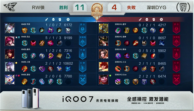 2分02秒,RW侠后羿大招开团打出1换2。2分28秒,深圳DYG拿下暴君。3分17秒,RW侠关羽击杀娜可露露。4分46秒,深圳DYG野区反打击杀盾山。5分02秒,深圳DYG娜可露露击杀嬴政。5分20秒,深圳DYG下路击杀后羿。6分35秒,野区团,RW侠打出2换3,随后破掉深圳DYG中一塔。7分37秒,双方团,RW侠击杀夏侯惇。8分37秒,RW侠上路打出1换2。9分08秒,RW侠破掉深圳DYG上二塔。9分42秒,RW侠拿下先知主宰。10分48秒,RW侠拿下暗影暴君,随后再控下暗影主宰。11分43秒,RW侠后羿大招定住姜子牙将其击杀。12分17秒,RW侠破掉深圳DYG中二塔。12分40秒,RW侠连续破掉深圳DYG三座高地。12分55秒,RW侠一波摧毁深圳DYG水晶赢下比赛!