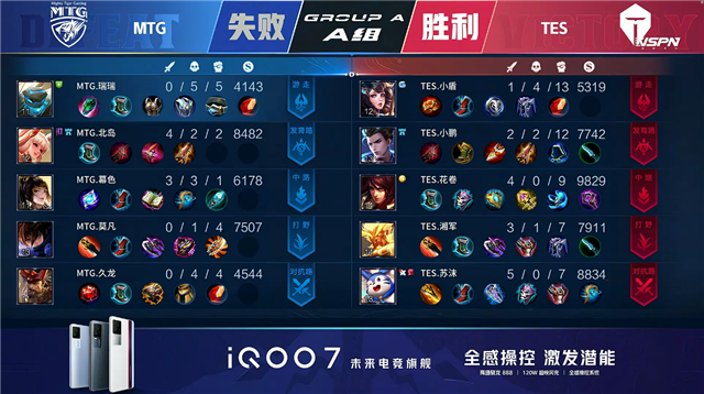 开局MTG公孙离中路抢线。1分01秒MTG下路击杀狄仁杰拿到一血。1分09秒MTG拿下中路河道之灵。1分57秒MTG下路击杀大乔。2分19秒TES拿下主宰。3分43秒TES下路击杀盾山。4分03秒TES击杀廉颇并抢到暴君。4分43秒TES野区击杀上官婉儿。5分08秒TES摧毁敌方上路外塔。5分29秒中路团战MTG打出1换2。6分43秒MTG野区击杀大乔。7分34秒TES拿下主宰。8分11秒中路团战TES打出0换3。8分22秒TES摧毁敌方中路外塔。8分30秒TES摧毁敌方中路二塔。10分17秒暴君处团战TES打出2换3。10分43秒TES摧毁敌方中路高地塔。11分30秒中路团战TES打出0换5。11分55秒TES摧毁敌方水晶拿下比赛。